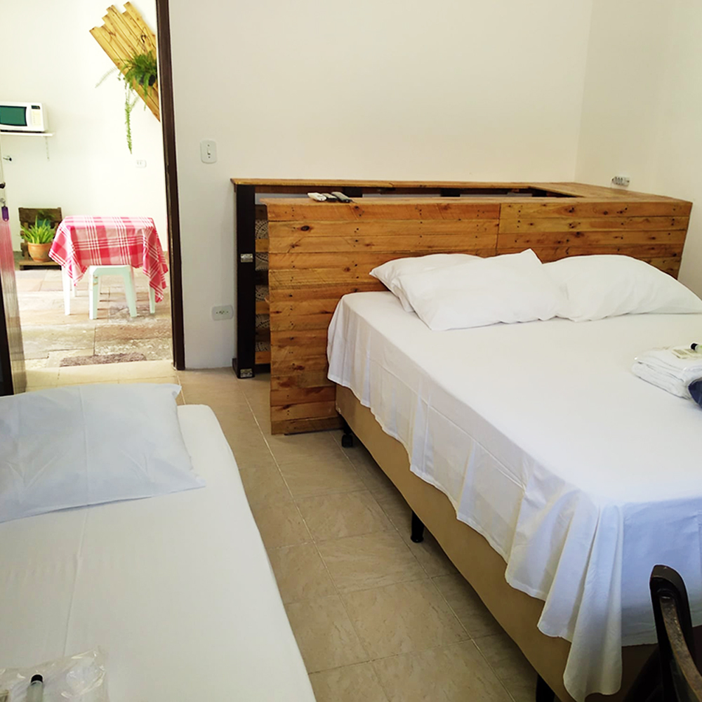 A Suíte Família é o apartamento ideal para acomodar a sua família. Com uma cama queen-size, duas camas de solteiro e piso frio, são recém-reformados.